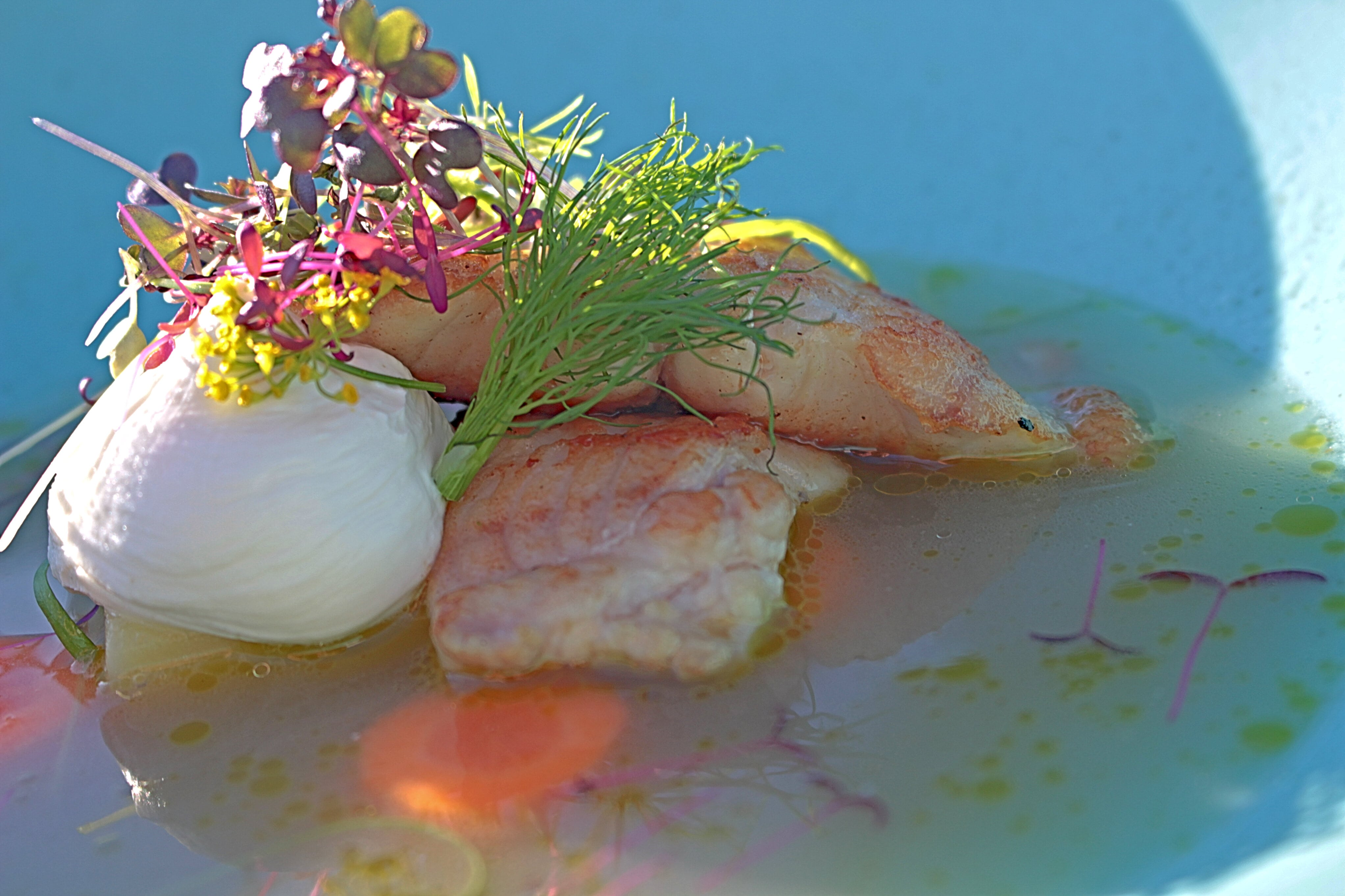 Baltvīnā un garšaugos tvaicēts sams ar sezonas dārzeņiem un grieķu jogurta mērci